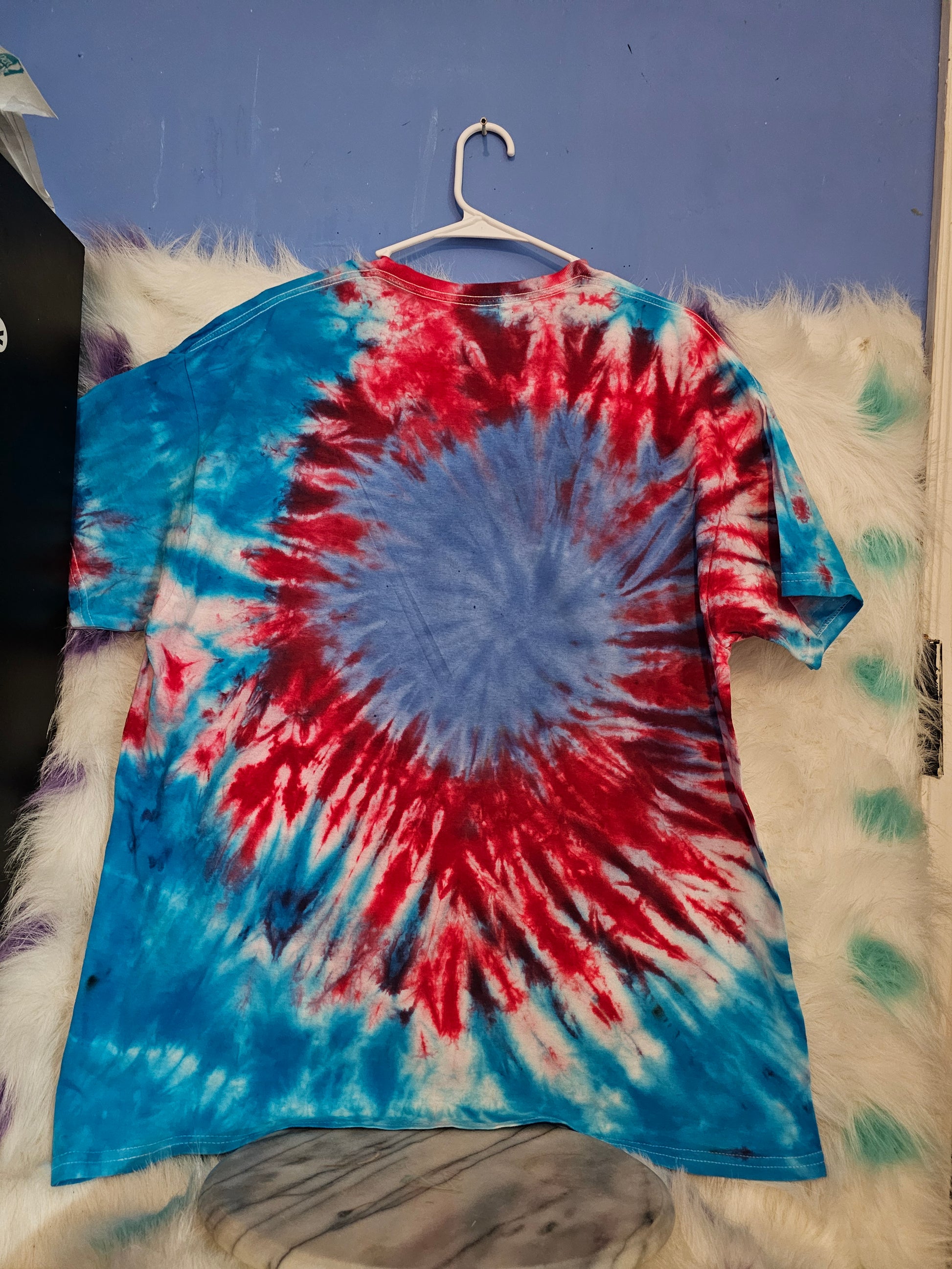 Introducing our Size XL 100% cotton blue & red tye dye All America chick Tshirt! Made with high-quality materials, this shirt offers ultimate comfort and style. Show your love for America with its unique tye dye design. Perfect for any casual occasion, this shirt is a must-have in your wardrobe.Washing instructions:Turn Shirt inside out and wash in cold or warm water and dry on low heat or air dry.DO NOT wash in Hot water.Your information is protected.