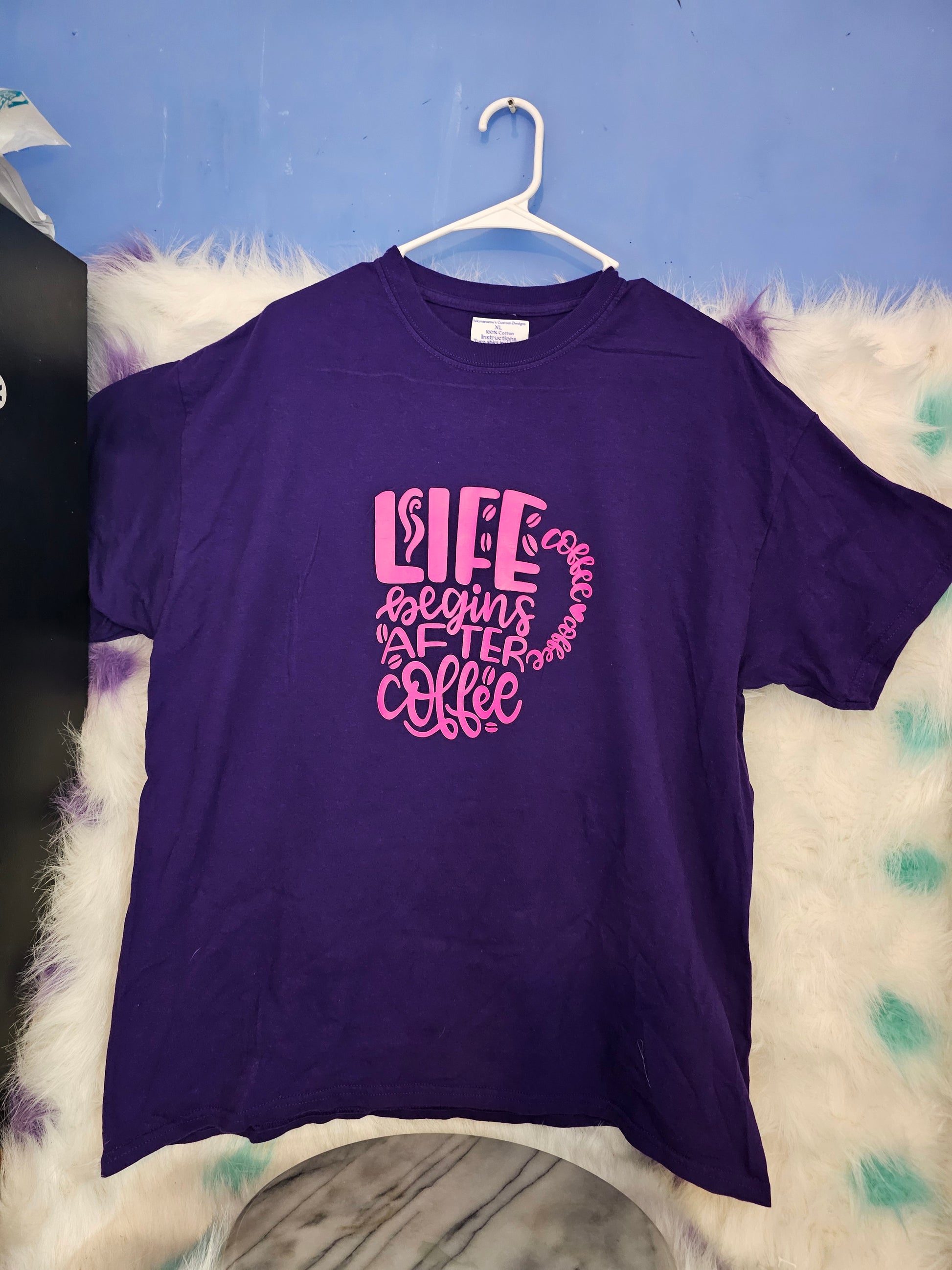 This Size XL 100% cotton Purple Life's begins after coffee Tshirt is perfect for coffee lovers. Made with 100% soft cotton and a bold purple color, it's comfortable and stylish. Show off your love for coffee and start your day right with this Tshirt.Washing instructions.Turn Shirt inside out and wash in cold or warm water and dry on low heat or air dry.DO NOT wash in Hot water.Your information is protected.