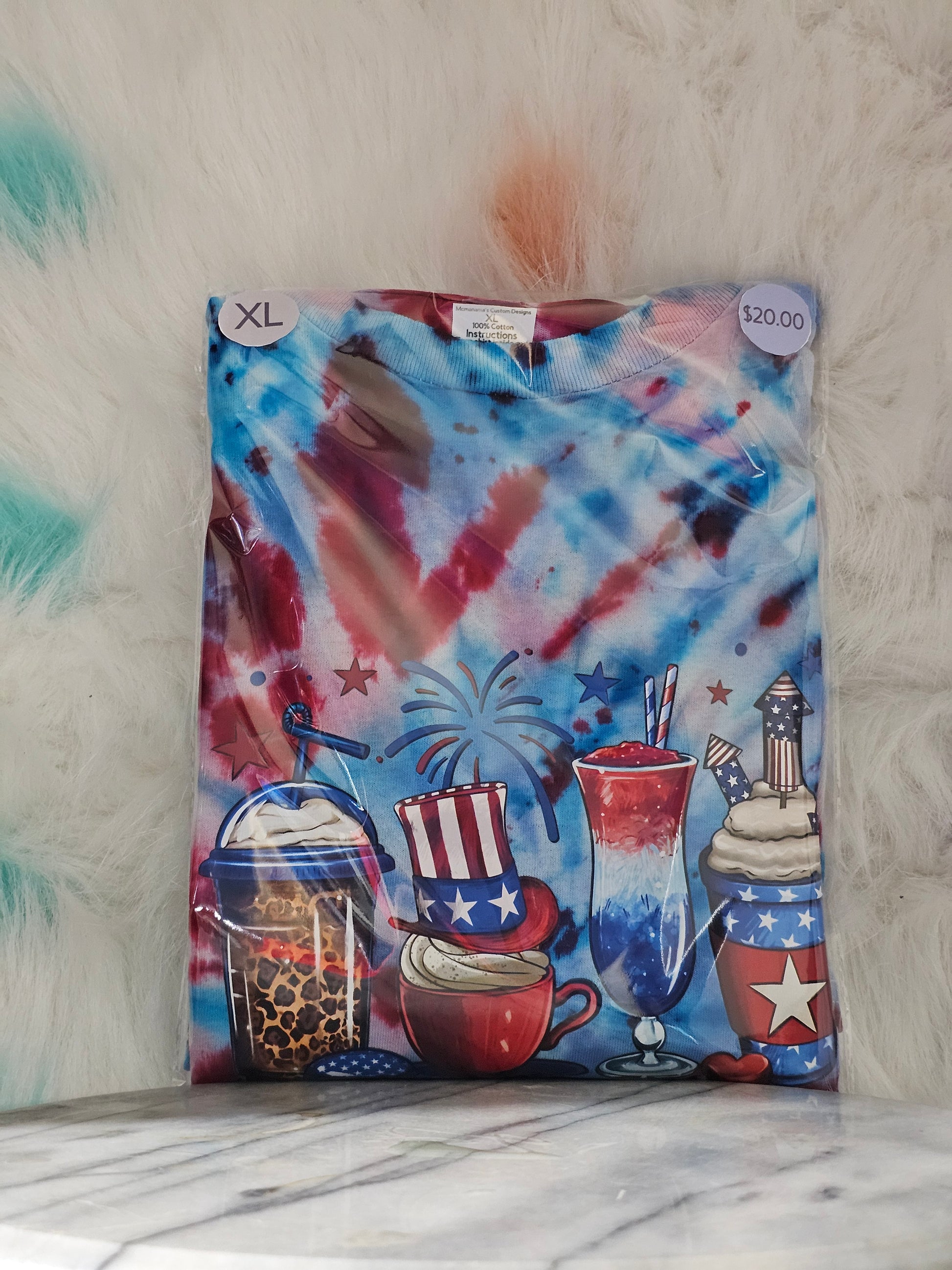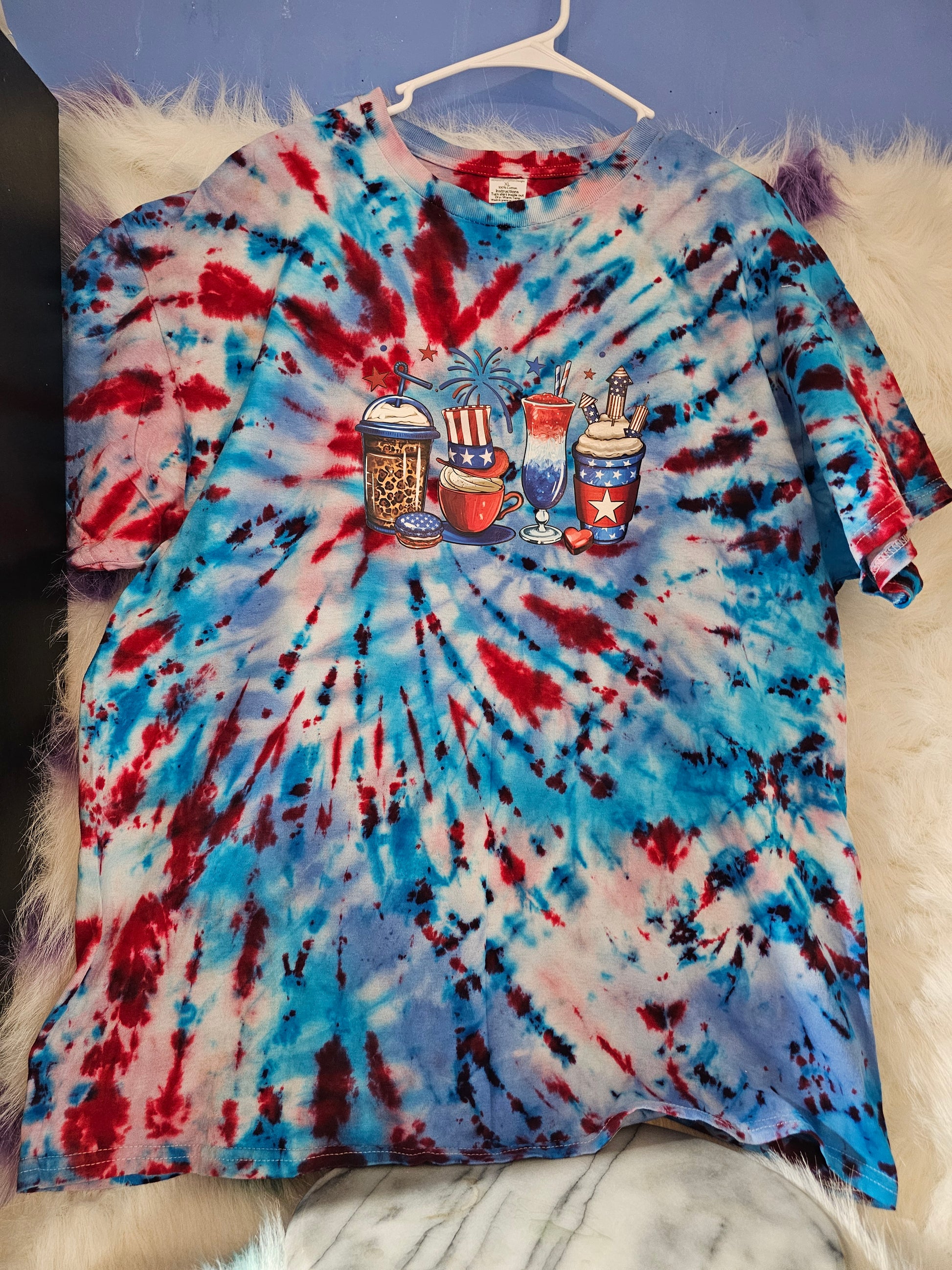 Upgrade your July 4th wardrobe with our Size XL 100% cotton tye dye Tshirt. Made with quality materials, this shirt celebrates the holiday with a fun and unique design. Wear it with confidence knowing you're supporting local artists and staying comfortable all day long.Size XL 100% cotton tye dye celebration of July 4th Tshirt. Washing instructions turn Shirt inside out and wash in cold or warm water and dry on low heat or air dry.DO NOT wash in Hot water.Your information is protected.