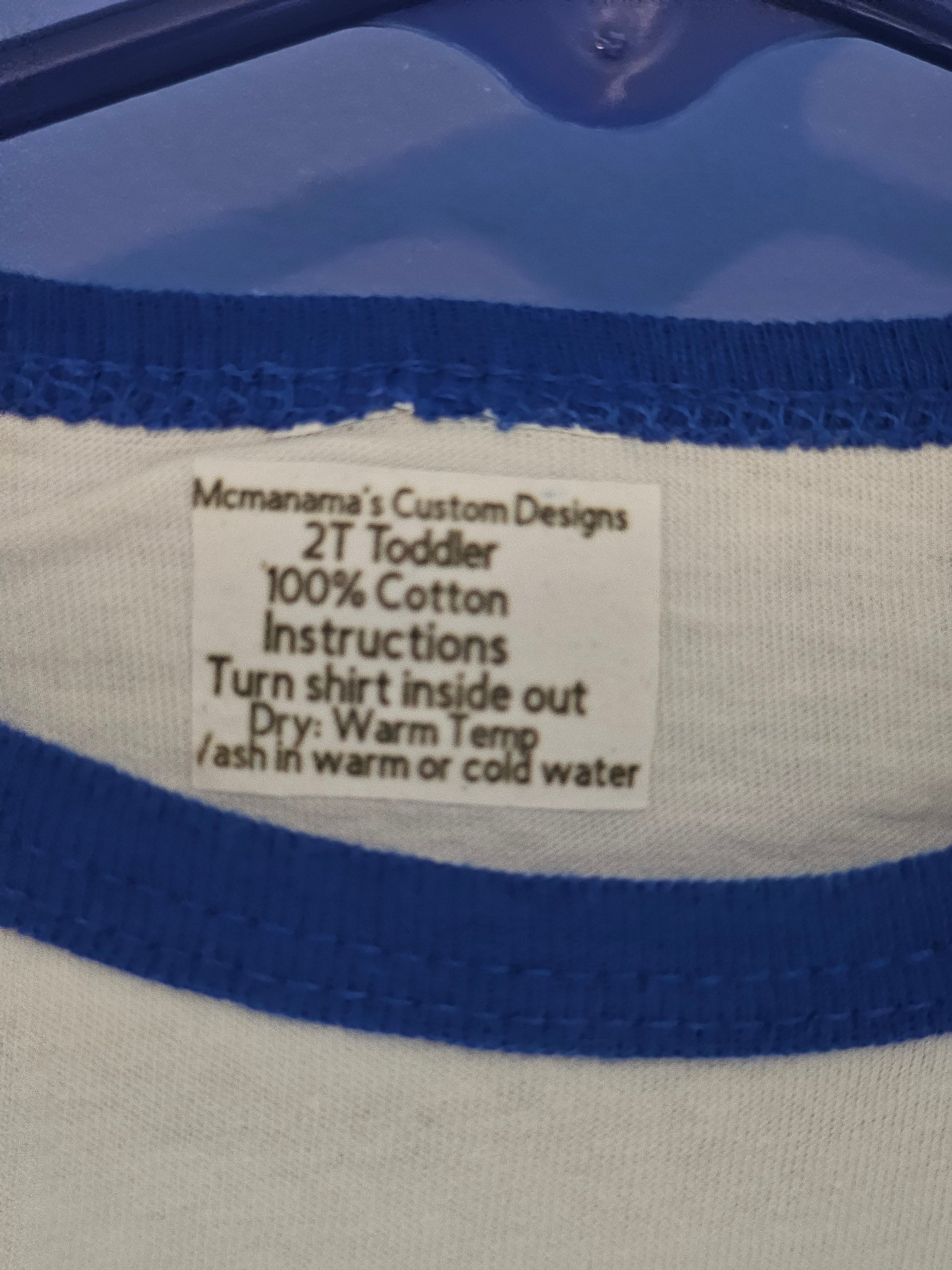 Elevate your toddler's style with our personalized shirt in size 2T. Made from 100% cotton, this white and blue shirt features the letter B and your child's name. Perfect for everyday wear, it's a fun and unique addition to their wardrobe.Size 2T 100% cotton White & blue Toddlers personalized shirt with the letter B and there name in the middle of the B. I can do any letter on a shirt with there name or monogram.I can make different sizes and colors. Washing instructions:Turn Shirt inside out and wash in cold or warm water and dry on low heat or air dry.DO NOT wash in Hot water.Your information is protected.