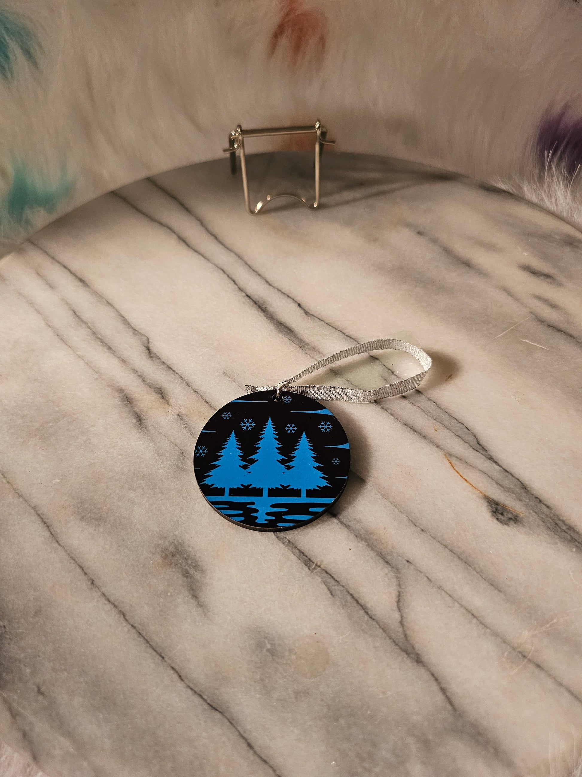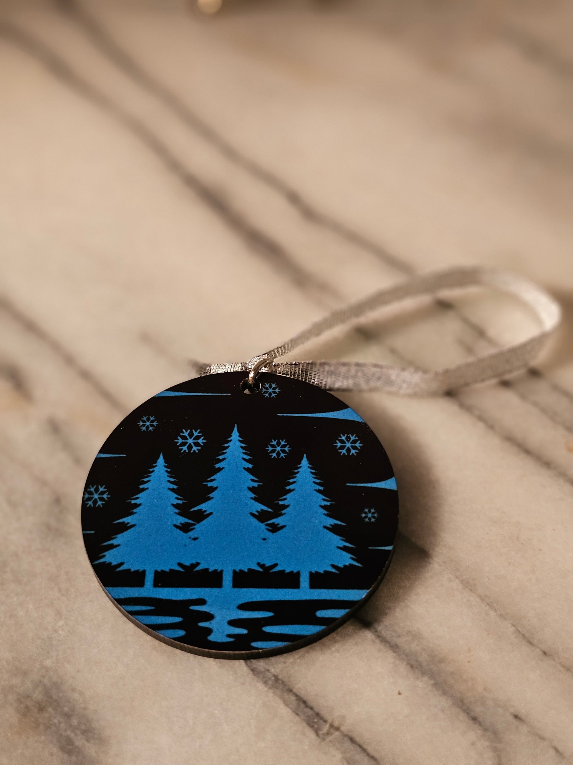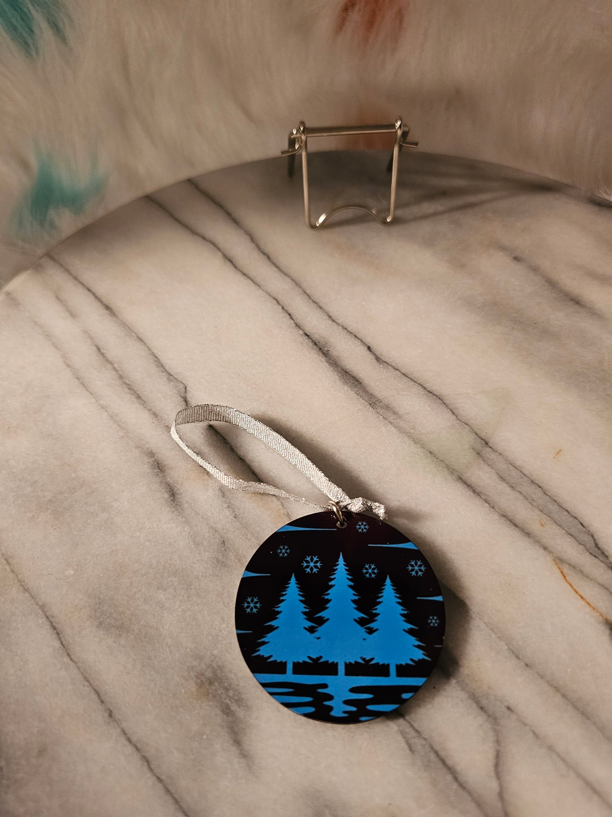 2 inch sublimation Christmas trees on a lake Christmas oranment. I make Keychains, Christmas oranments, Magnets and Dog tags. I have tumbler cups to and much more.