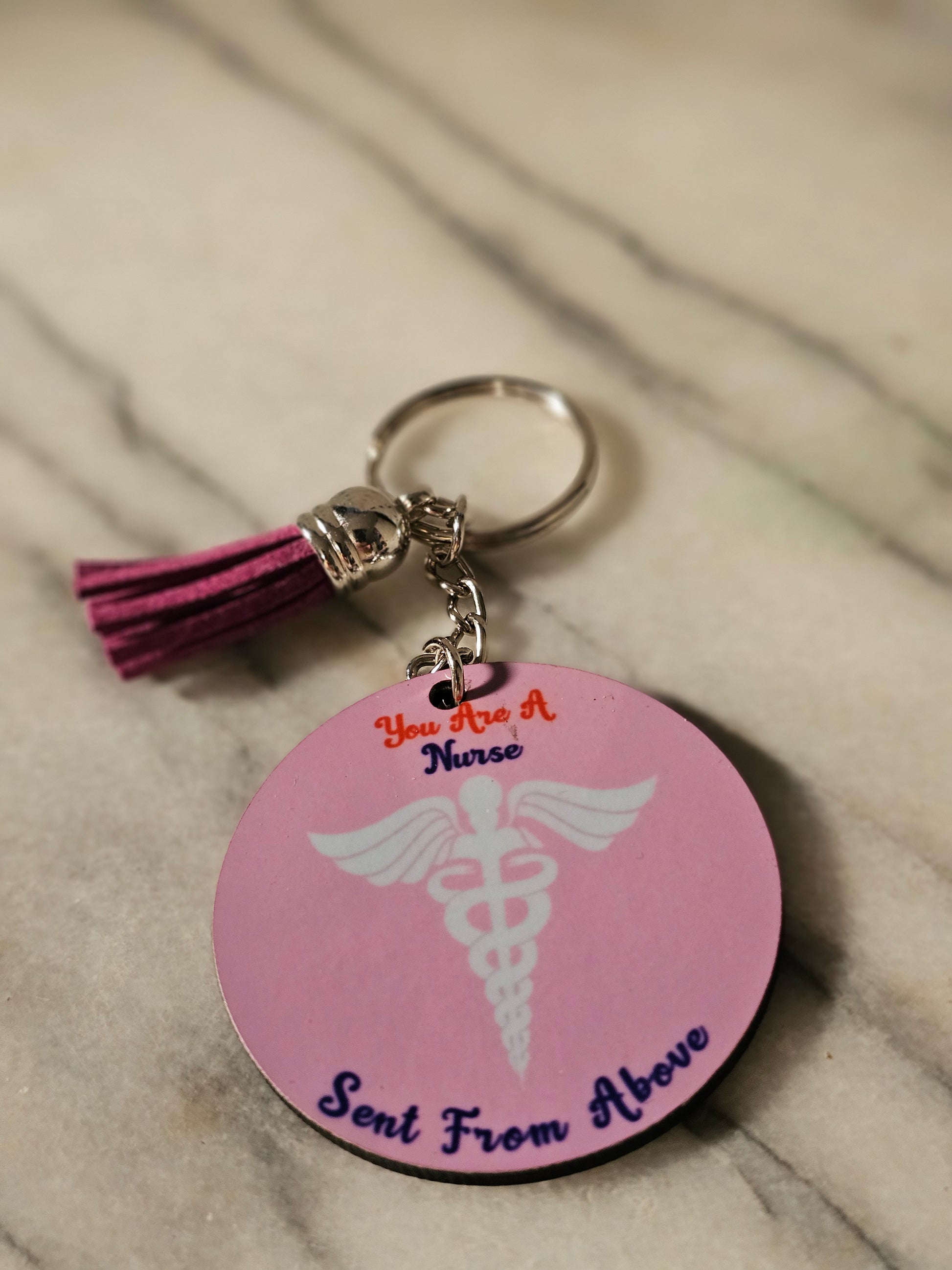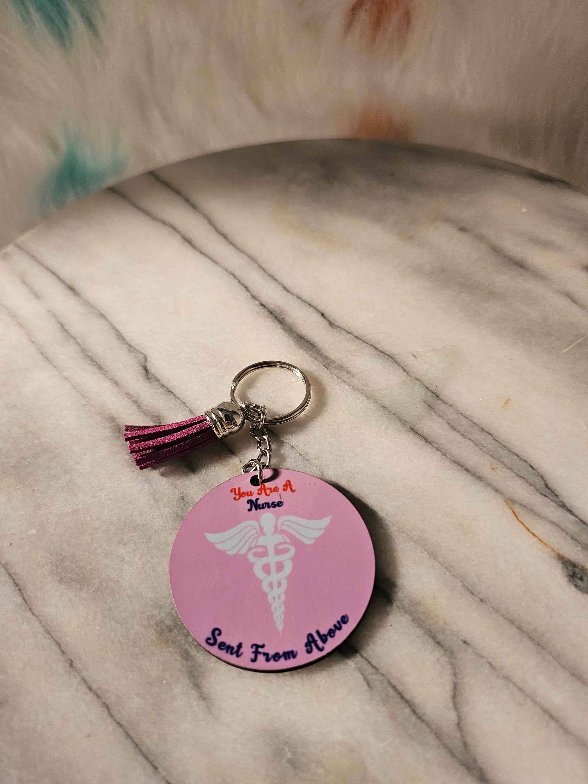 Sublimation Nurse sent from heaven. I can personalize them for you with about any picture you would like on it. I make Keychains, floating Keychains, Christmas oranments, Magnets and Dog tags.
