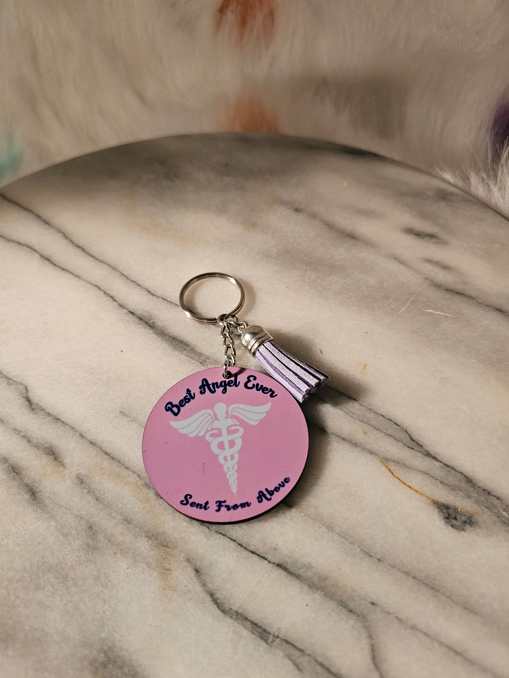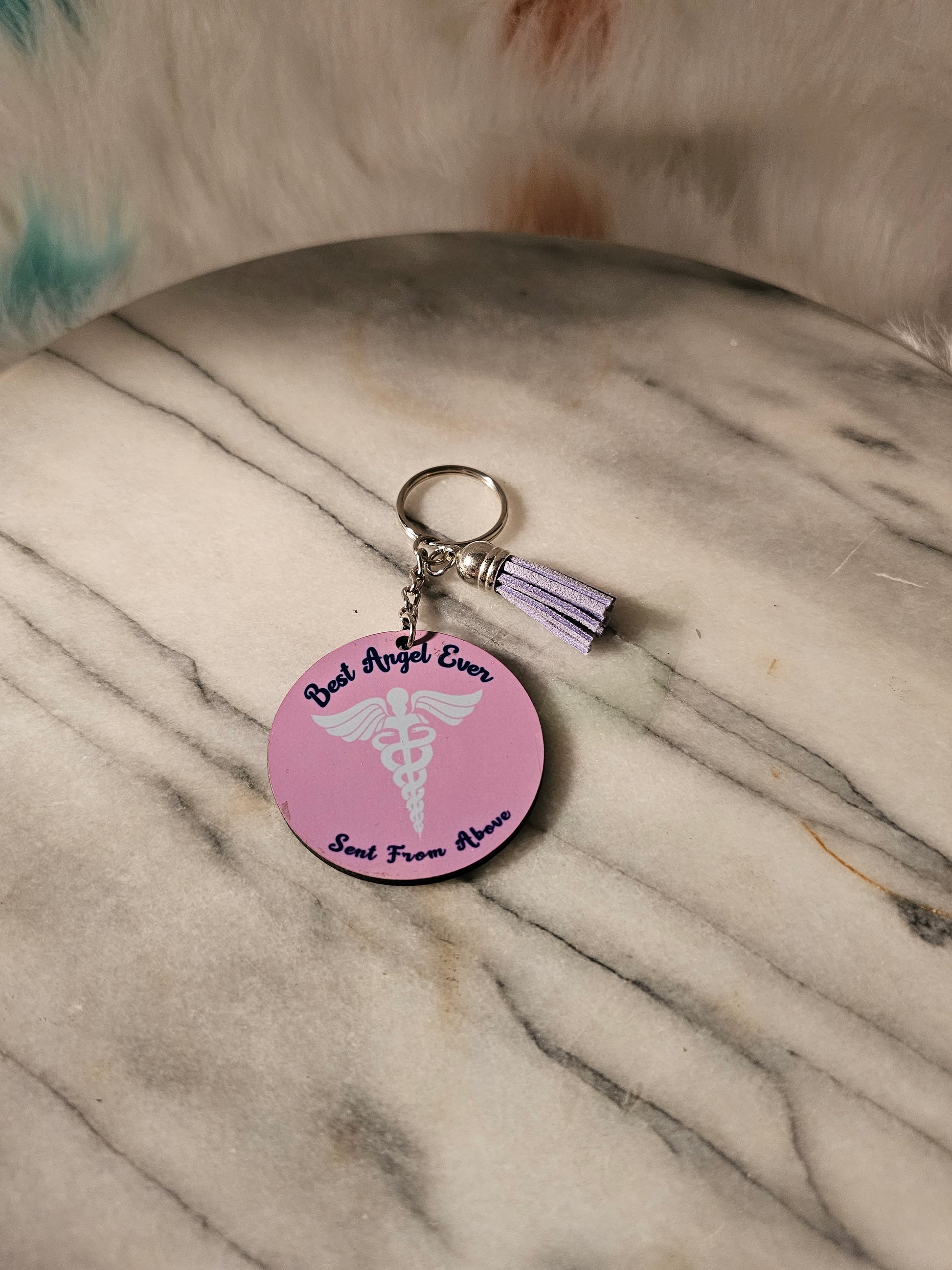 2 inch sublimation Best Angel ever Keychain. I can personalize them for you with about any picture you would like on it. I make Keychains, floating Keychains, Christmas oranments, Magnets and Dog tags.