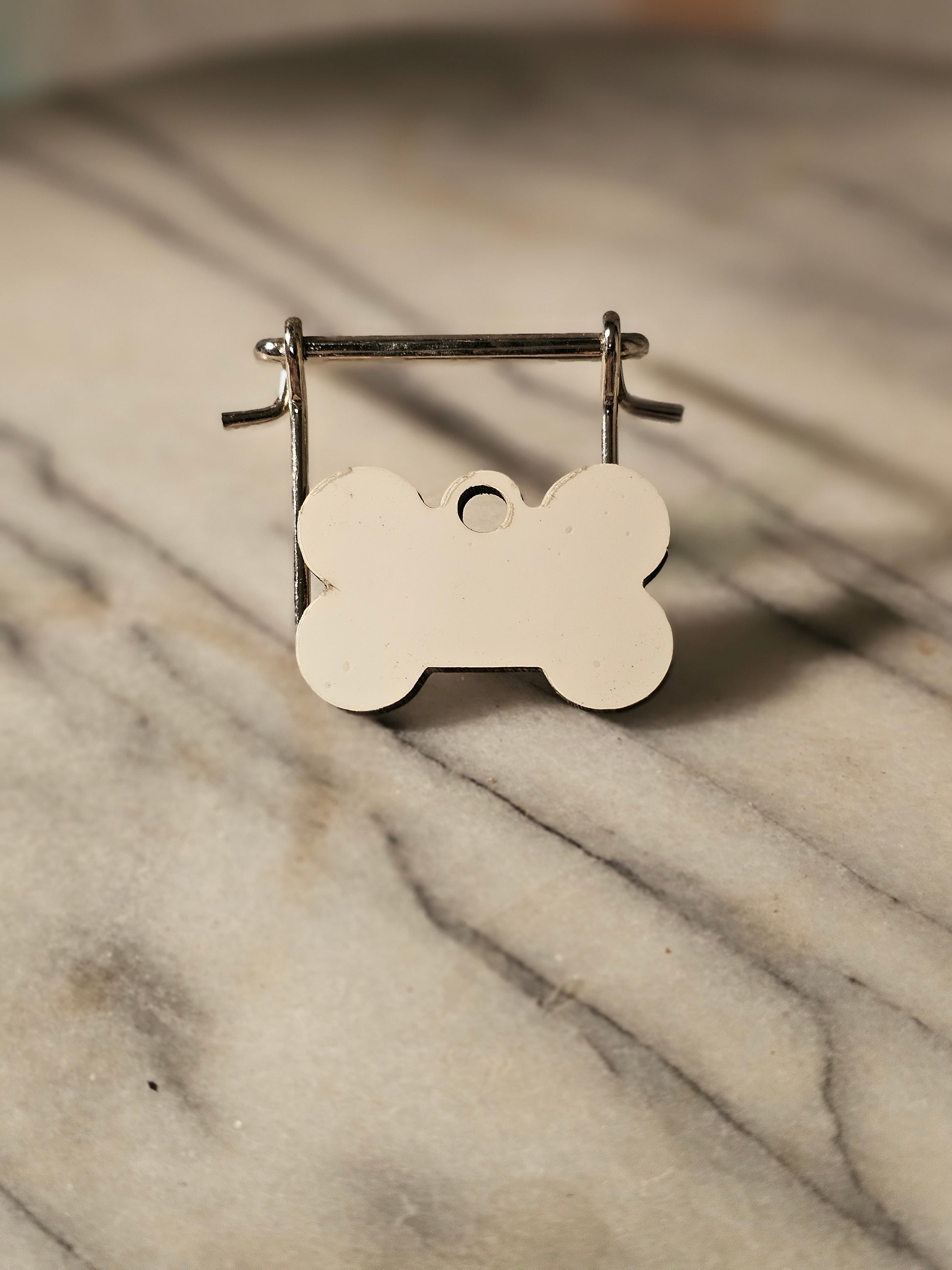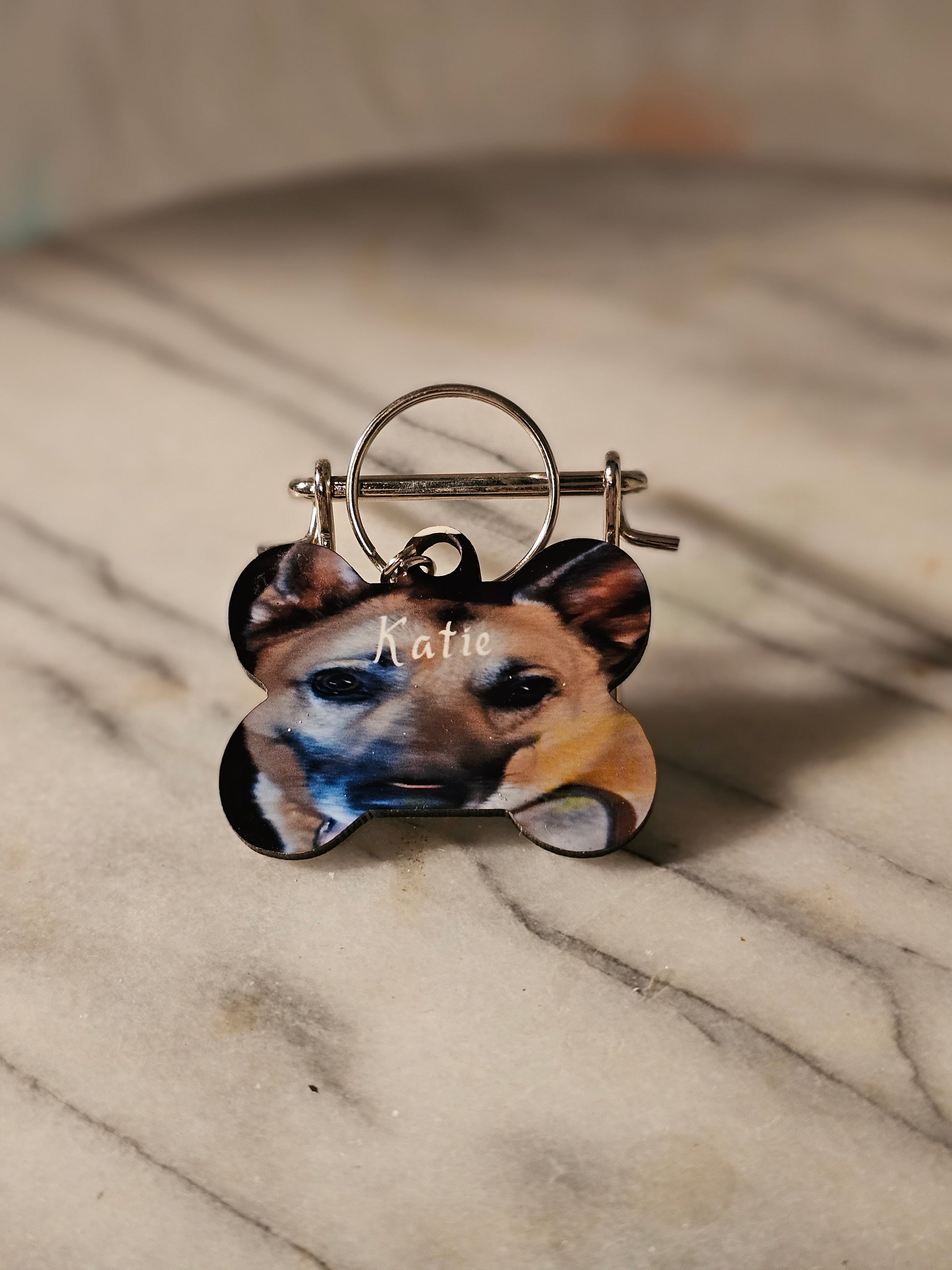 Small Dog tag with the pet's picture and name on front and owner's name and phone number on back. I can personalize them for you with about any picture you would like on it.I make Keychains, floating Keychains, Christmas oranments, Magnets and Dog tags